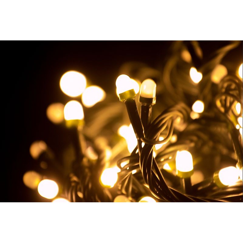 Nové vianočné led osvetlenie s oblými led diódami nazývane aj maxi led dióda 180ks led diód teplej bielej farby na zelenom kábli,svetelná dĺžka 17 metrov,prívodný kábel je 1,5m dlhý.Vhodné na výzdobu vianočného stromčeka vysokého tak od 170cm do 200cm alebo tam kde potrebujete klasickú spájateľnú reťaz - girlandu.
